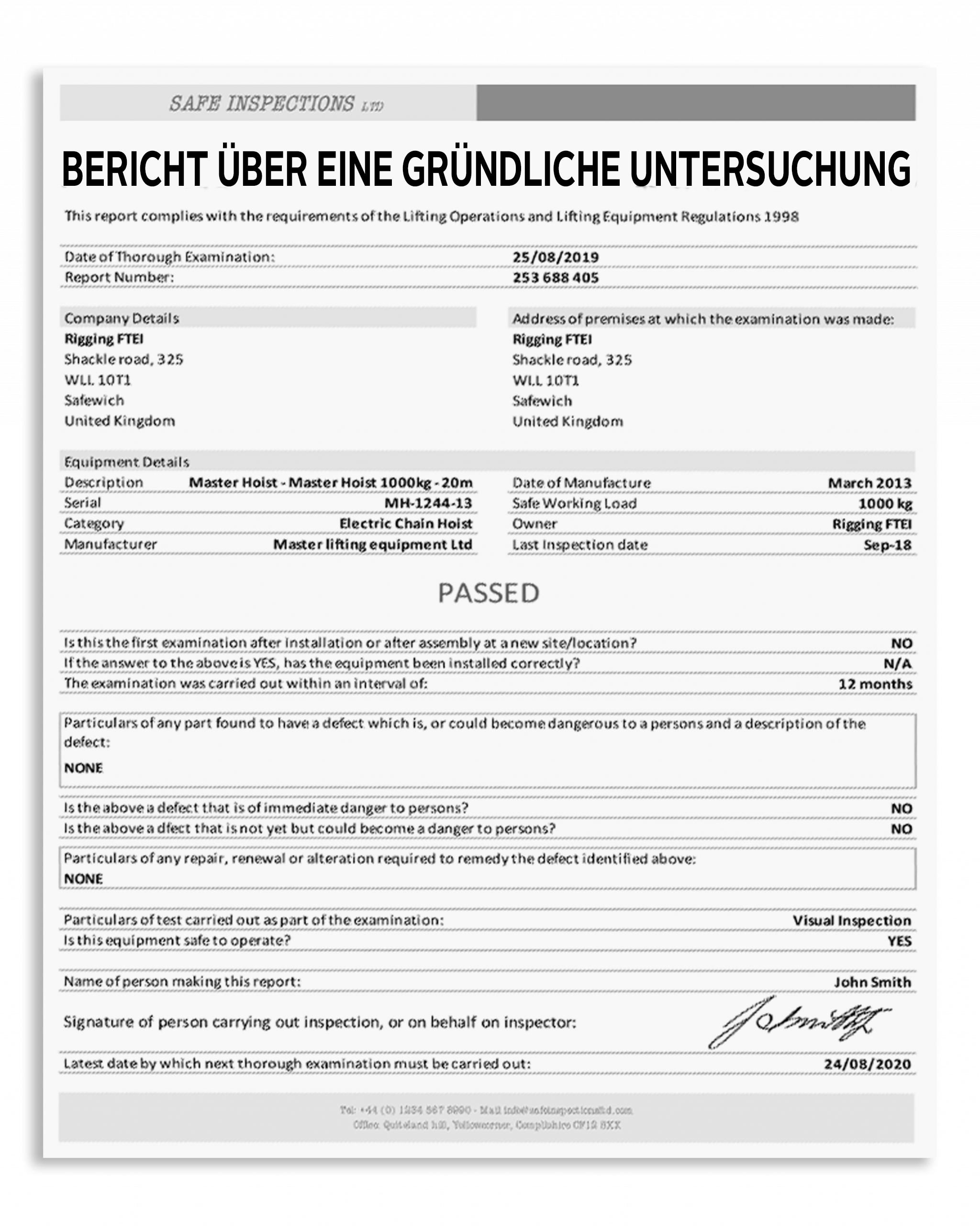 von Prüfbescheinigungen oder der Herstellerdokumentation