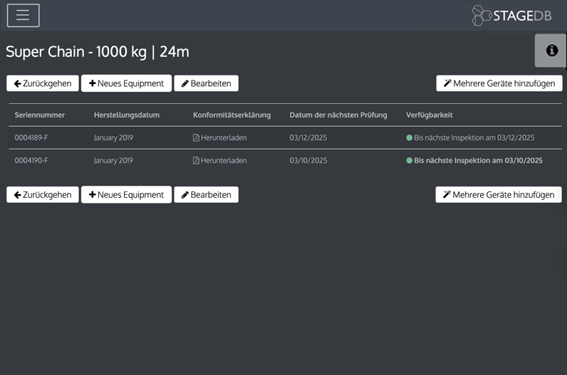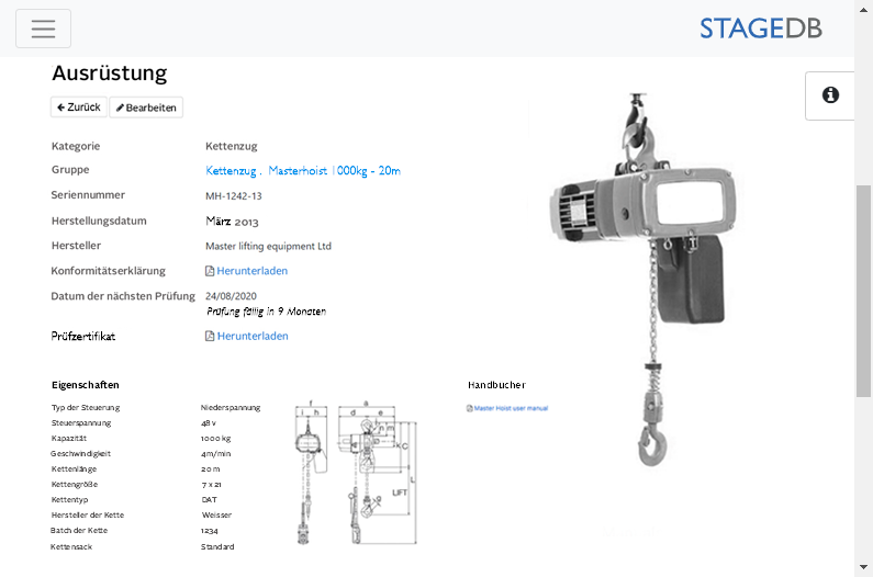 Mit EDB können Sie die EG-Konformitätserklärung, Prüfbescheinigungen, Wartungsberichte, Logbücher und Anweisungen Ihrer Bühnenausrüstung verwalten und benutzerdefinierte Dokumente zur Ergänzung Ihrer technischen Dokumentation hinzufügen.
