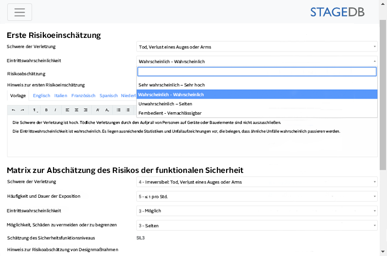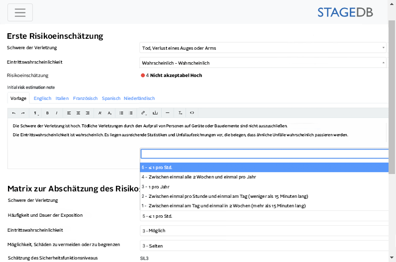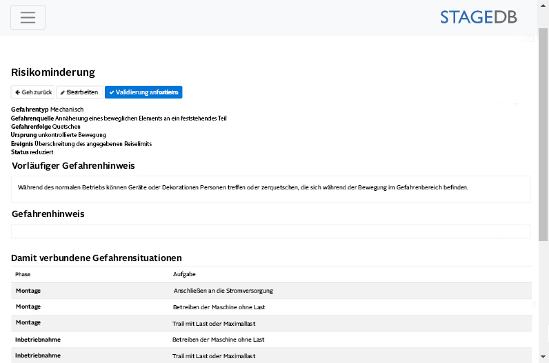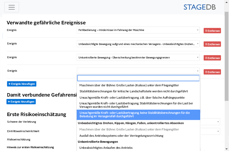 Die Online-Risikobeurteilung ist ein Modul, das zum Basispaket Ihres StageDB-Kontos hinzugefügt werden kann. ORB eignet sich zur Erstellung von Risikobeurteilungen bzw. Gefährdungsbeurteilungen szenischer Bewegungen auf Basis der EN ISO 12100:2010, entsprechend den Anforderungen der DIN 56950-1:2012, SQ P2:2018 und EN 17206.