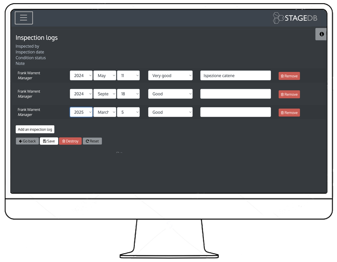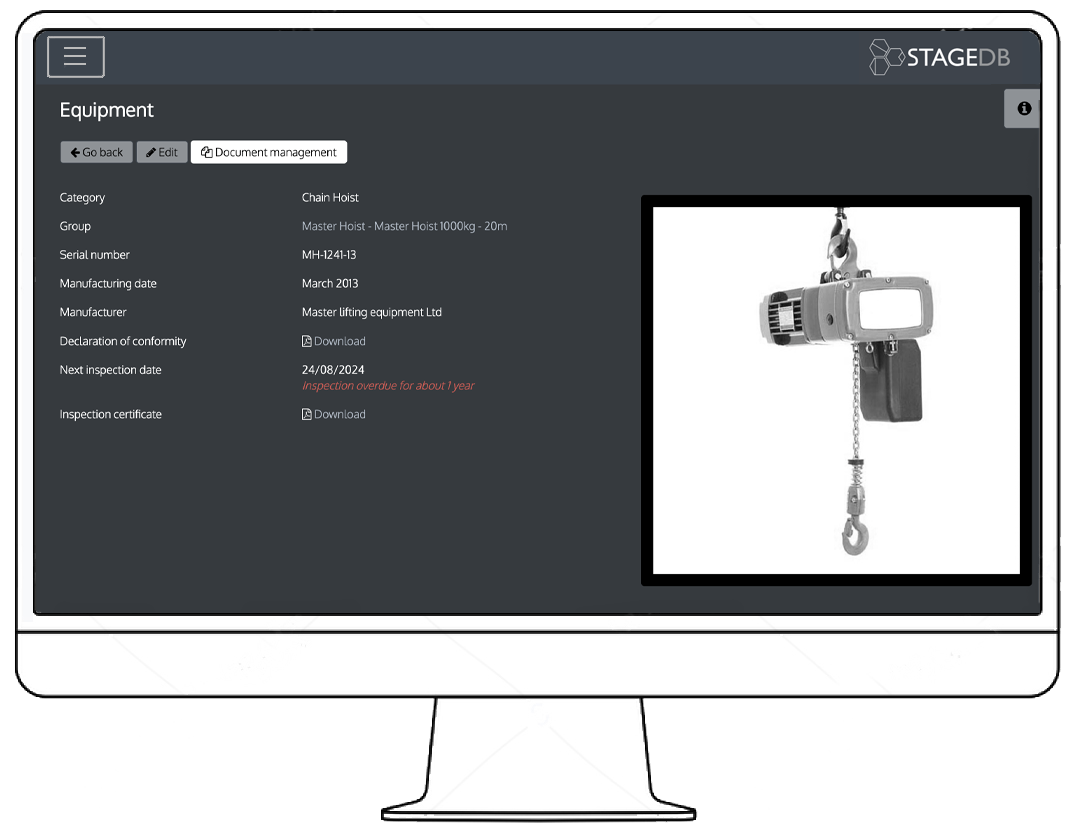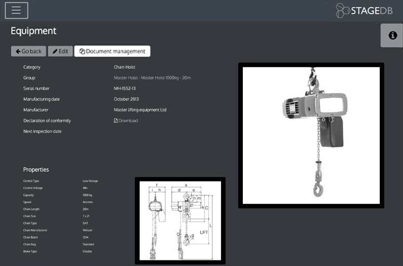 With EDB you can manage your stage equipment’s EC Declaration of Conformity, Inspection Certificates, Maintenance Reports, Logbooks, Instructions and add custom documentation to support your technical file.