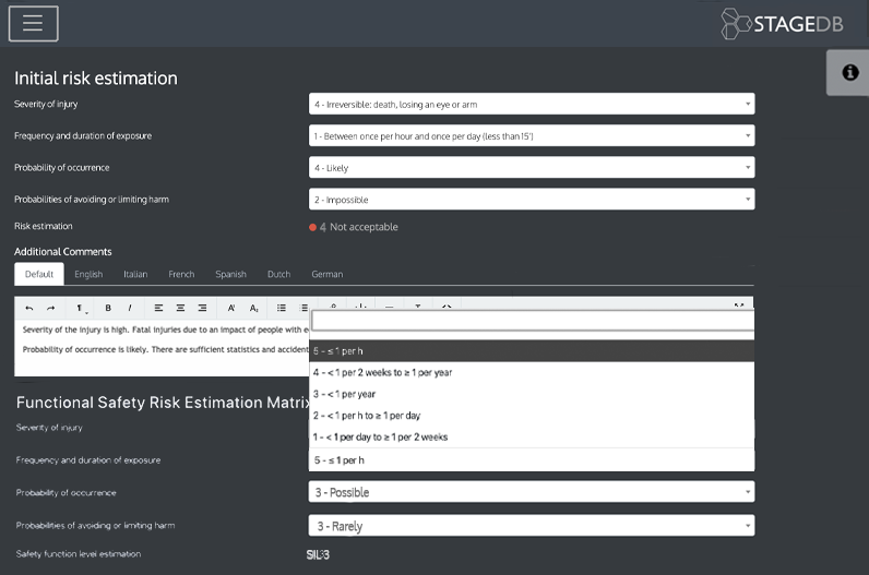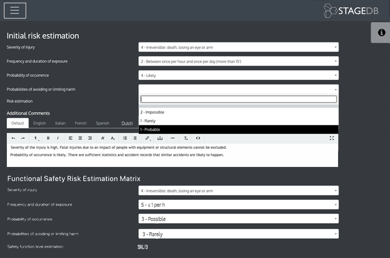 ORA lets you define your own risk estimation matrix. You can choose to define your matrix based on the SIL (EN 62061) or the PL (EN ISO 13849) structure or to create your own matrix.