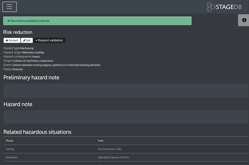 0% hazard allocated, 20% Risk Analysis completed, 40% Risk Assessment in progress, 60% Risk Assessment draft completed, 80% Request of Validation and 100% Validated.