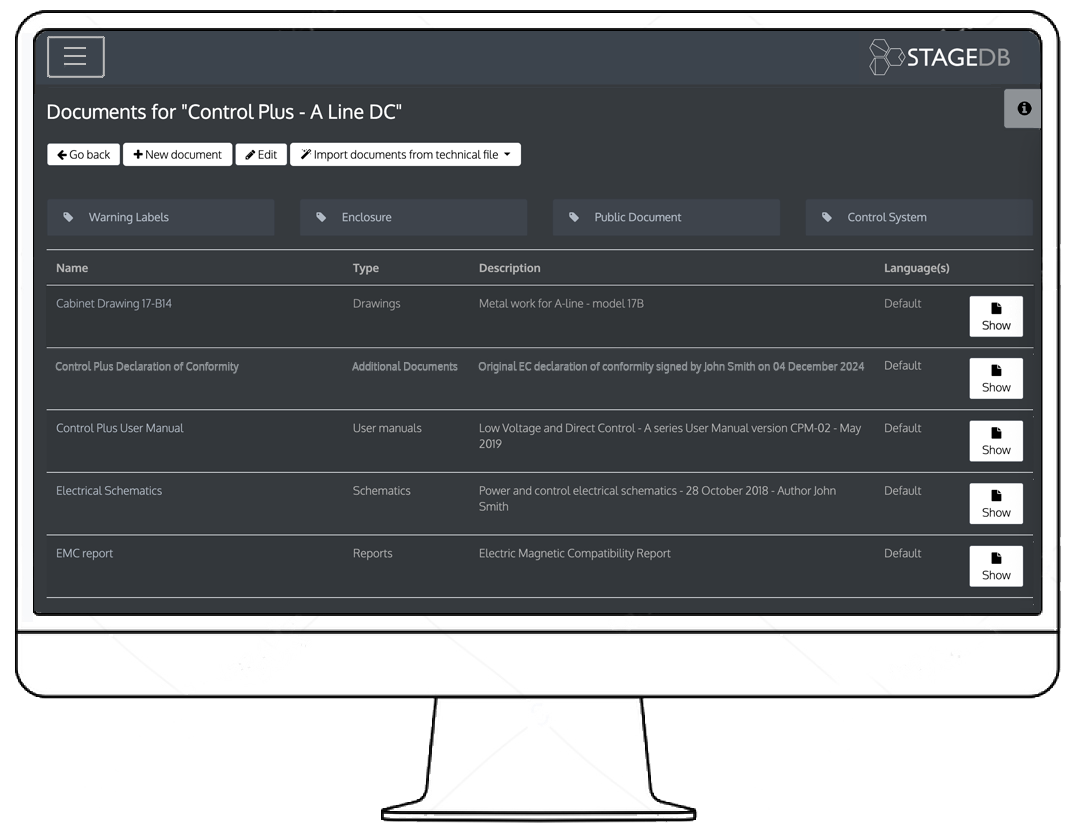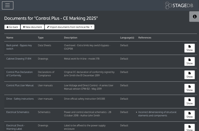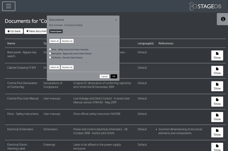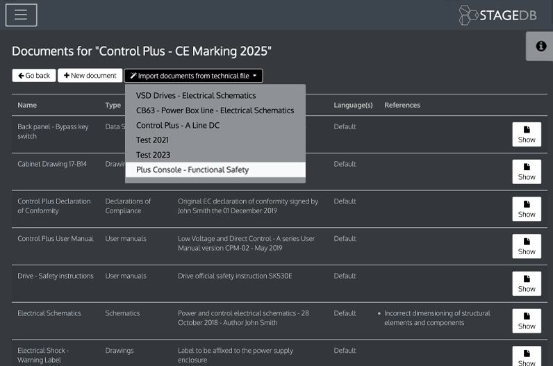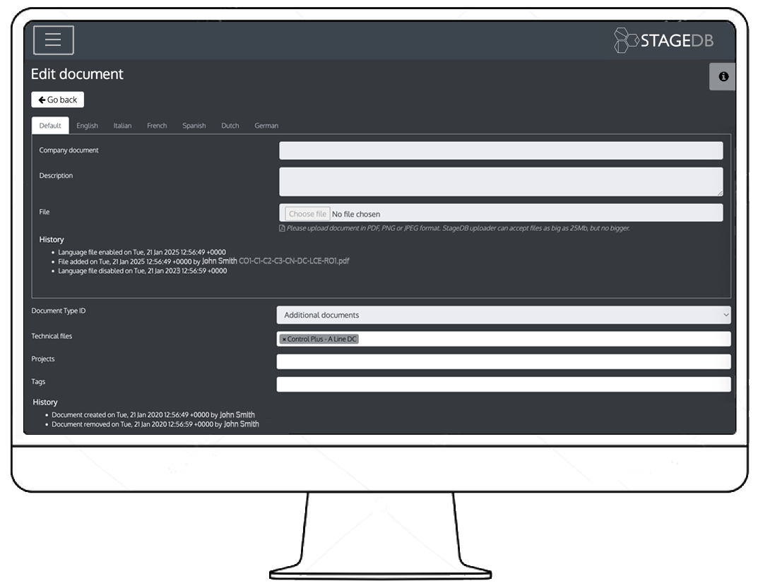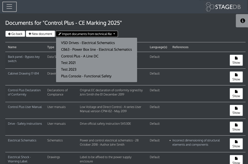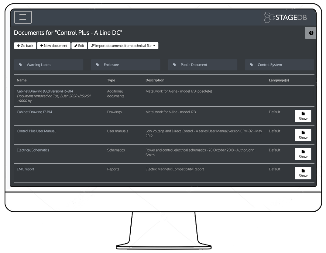Smart Technical File is a module that can be added to your StageDB account’s basic package. STF gives you a quick and efficient way to organise your engineering technical documentation. You can store full technical files, categorise each document with customised tags, keep track of the file history and associate files with projects.