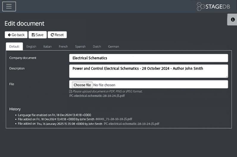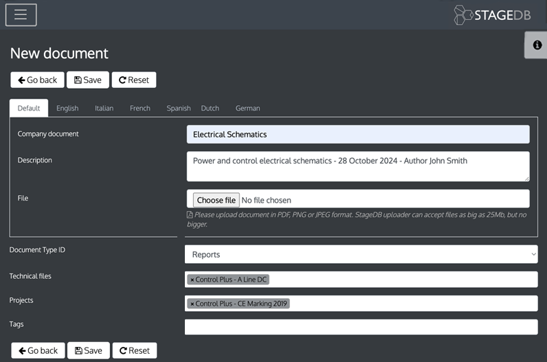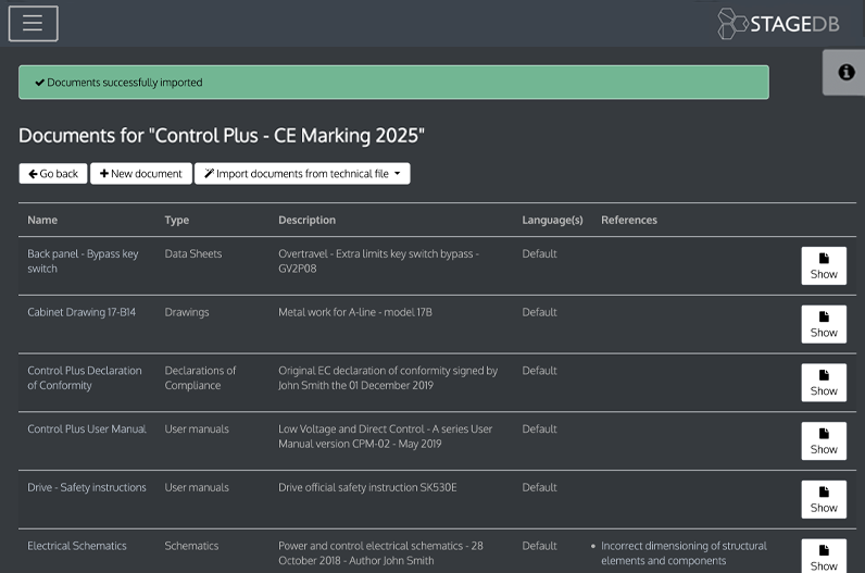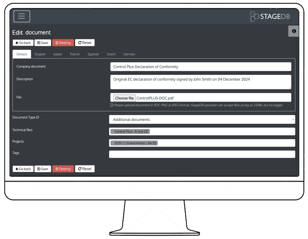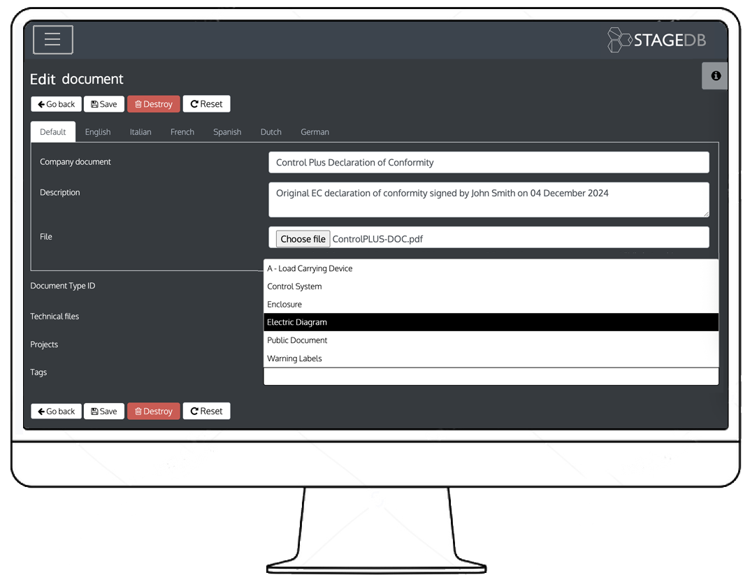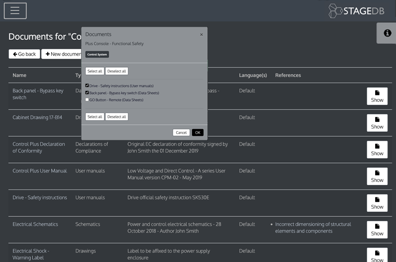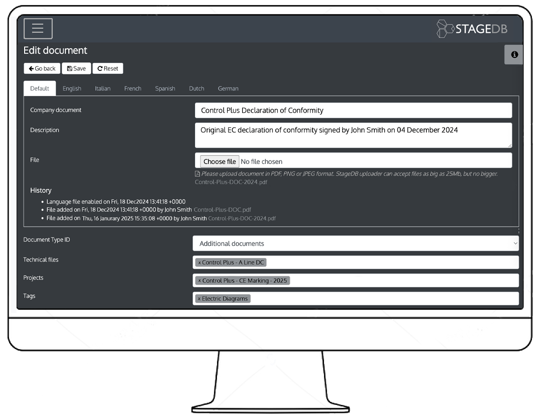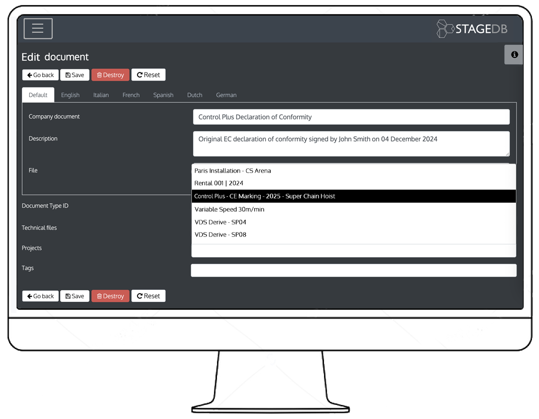 Smart Technical File is a module that can be added to your StageDB account’s basic package. STF gives you a quick and efficient way to organise your engineering technical documentation. You can store full technical files, categorise each document with customised tags, keep track of the file history and associate files with projects.