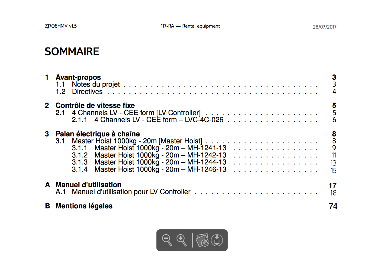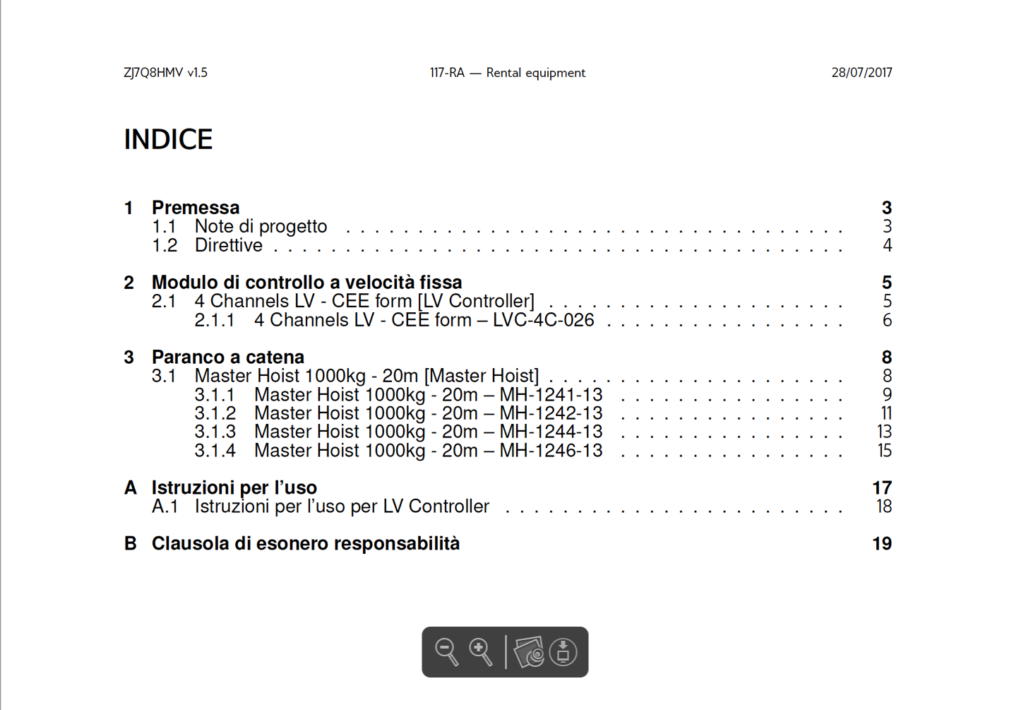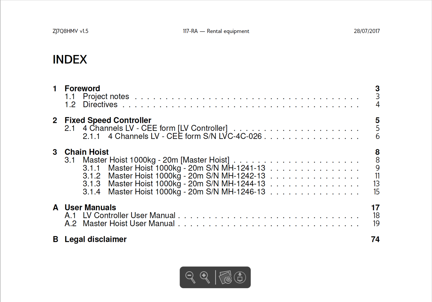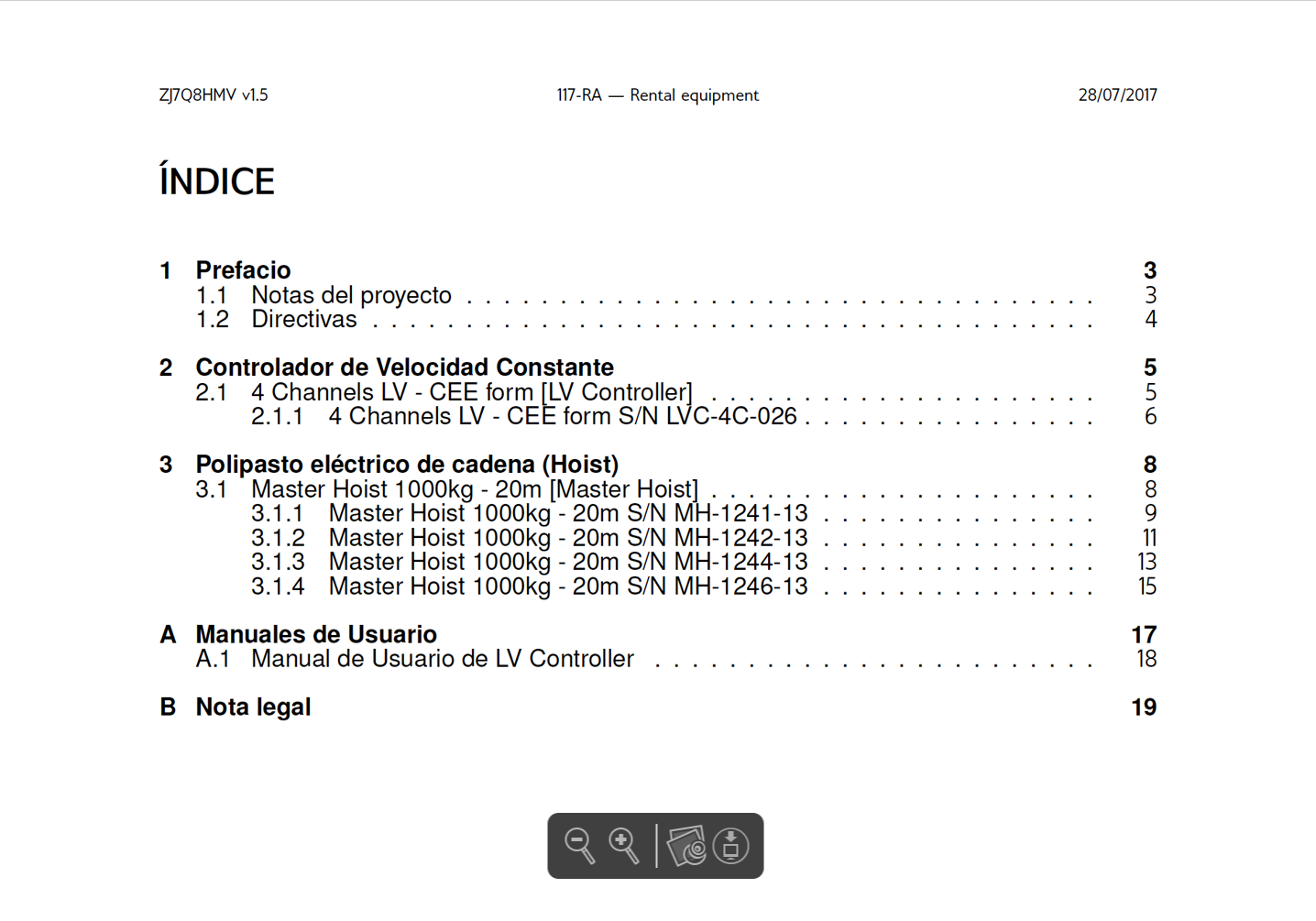 This SETD includes a listing of all lifting machinery elements involved in a full system for the project, complete with their serial numbers. It states the good condition, maintenance, efficiency and safety of the equipment at the time of the latest inspection.